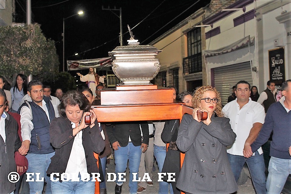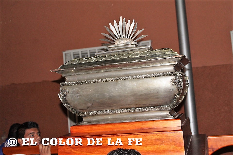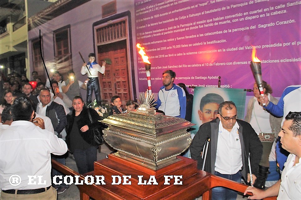 Pasadas las 9:00 de la noche, la urna con las reliquias llegó al panteón y fue colocada en el altar dedicado a San José Sánchez del Río, justo en el lugar donde recibió el tiro de gracia, para ser veneradas por los fieles y trasladarlas de regreso a la Parroquia de Santiago Apóstol en medio de vivas, cantos y oraciones, para finalizar con las quema de 90 bombas de luces en recuerdo del 90 aniversario del martirio de San José Sánchez del Río.