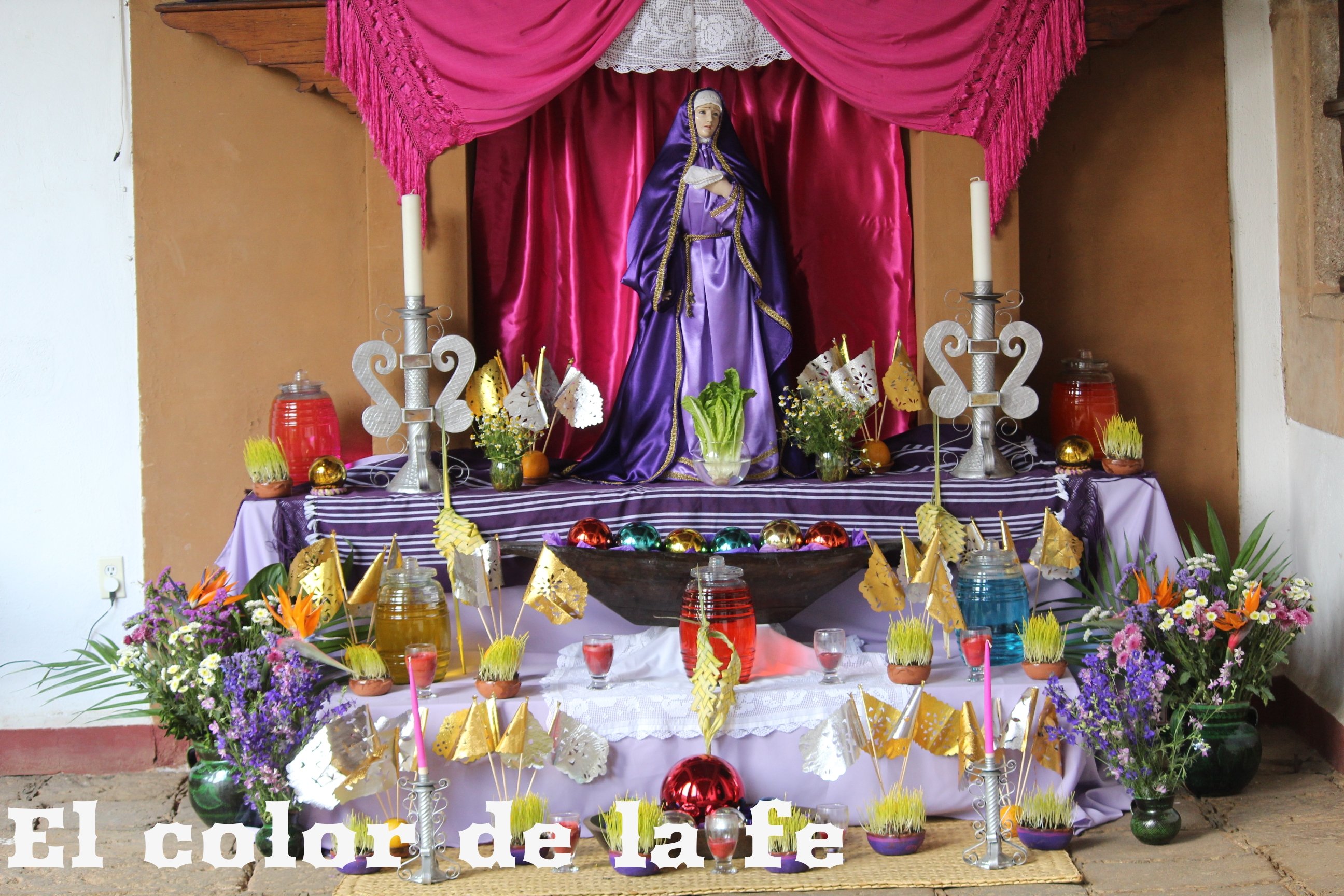 El color que destaca dentro del altar es el morado, que significa austeridad y penitencia y es común que la Virgen luzca un manto negro, morado o azúl marino en señal de luto por la muerte de su hijo. Otro de los elementos que destaca son los germinados de trigo que representan la fertilidad y la Eucaristía: María es la tierra fértil en la que germinó Cristo, el trigo molido en el Calvario para convertirse en el Pan de Vida Eterna. El trigo también representa la naturaleza divina de Cristo oculta en su apariencia humana, como redentor en su pasión y se le ponen a la Virgen para recordar que ella asistió a este misterio del sufrimiento, pasión y muerte de Cristo.