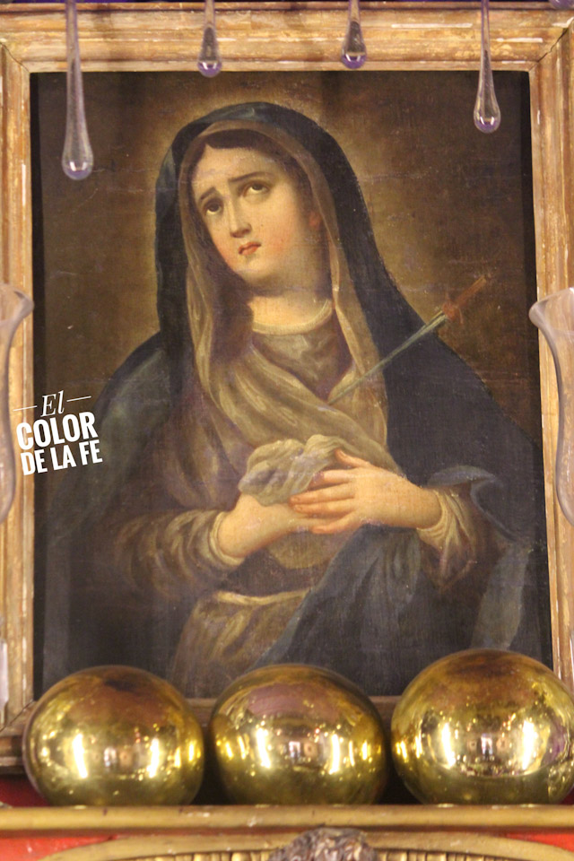 En el centro era colocada la imagen de la Virgen de los Dolores, ya fuera en pintura o en escultura revestida con ricos vestidos de terciopelo morado o negro bordados con hilos de oro y luciendo un corazón traspasado con siete espadas que representan sus siete dolores y un pañuelo entre las manos para enjugar sus lágrimas.