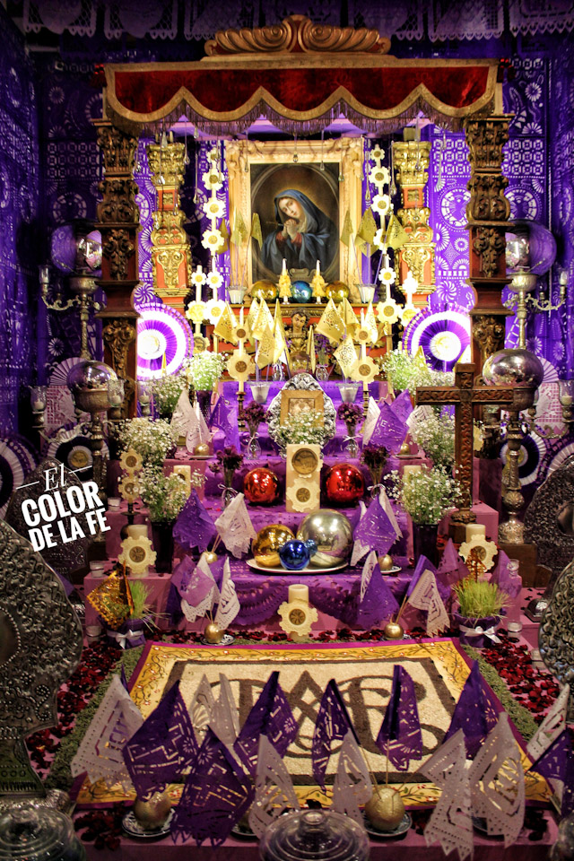 Al fondo se colocaban cortinas con vistosos encajes que en las familias humildes fueron reemplazados por papel picado con imagenes alucivas a la Pasión de Cristo.