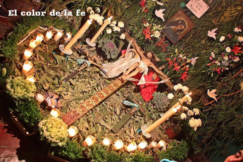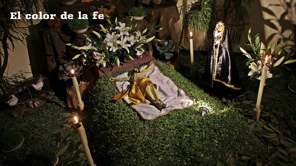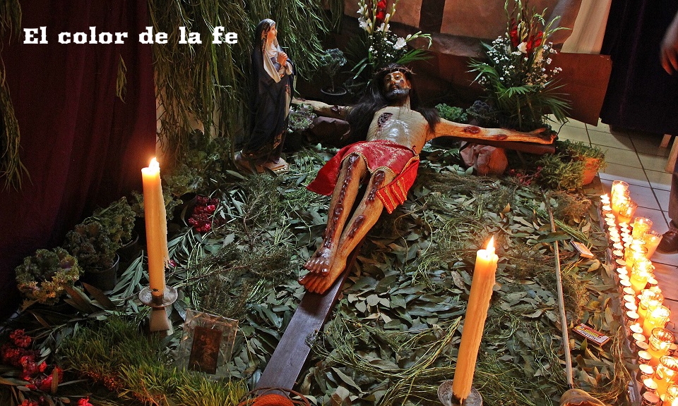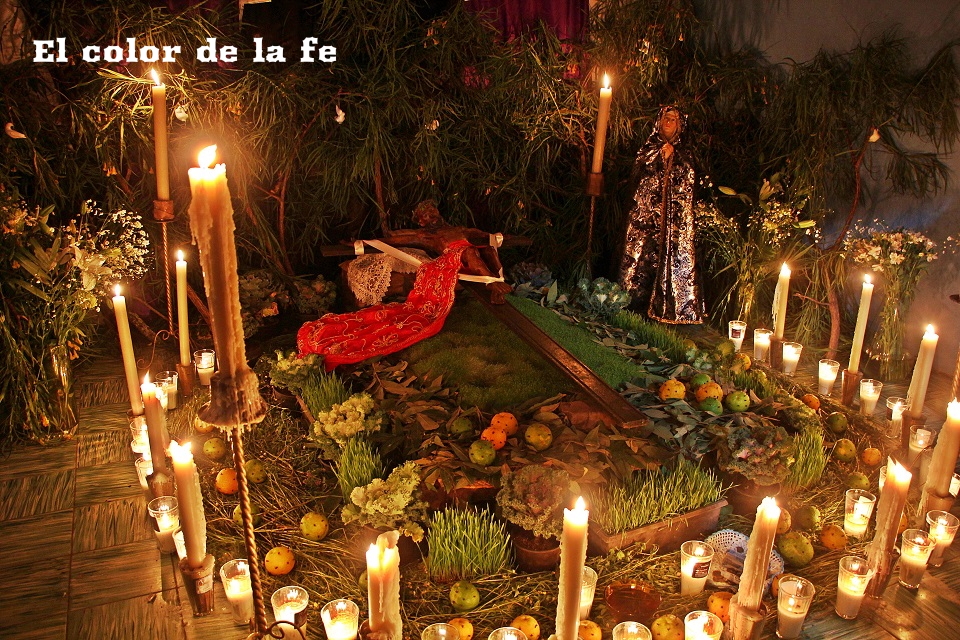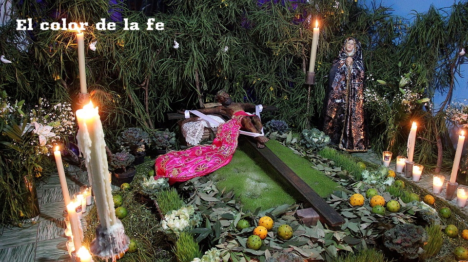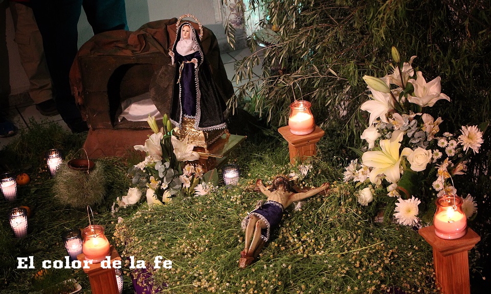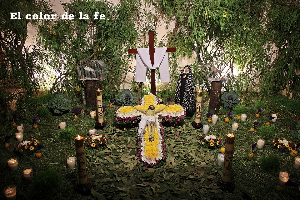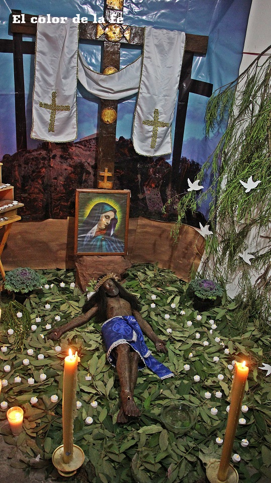 El Viernes Santo por la mañana comienza la tarea de preparar el altar dónde será tendido el Cristo. La capilla ardiente es decorada según el gusto y posibilidades, lo que nos permite encontrar altares de todo tipo, los cuales se abren a los visitantes a las tres de la tarde. Los elementos que no deben faltar, son ramas de laurel de cerro, trébol y alfalfa con las que se elabora un tapete en toda el área, también se unen a la decoración ramas de sabino, sauz y jaral para representar el huerto de los olivos, cubriendo muros y en algunos casos el techo. Sobresalen entre la decoración naranjas agrias decoradas con clavos de olor (elemento que usaban los indígenas para disimular el olor de los cuerpos en descomposición), germinados de trigo, que son sembrados el “Viernes de Lázaro” dando sentido a que al brotar, nos recuerda la resurrección y la aromática manzanilla que purifica el ambiente junto al humo del copal. Entre el altar, puede observarse la imagen de «La Dolorosa», la Virgen Madre que se encuentra triste por la pérdida de su hijo, siendo acompañada por palomas habaneras, las cuales con su triste canto dan consuelo a la Virgen en su soledad. La profusión de velas y veladoras depende del gusto, siendo de preferencia treinta y tres veladoras por la edad en que murió Cristo y en grupo de doce, por los doce apóstoles que acompañaron a Jesús y 5 cirios por las llagas de Cristo.