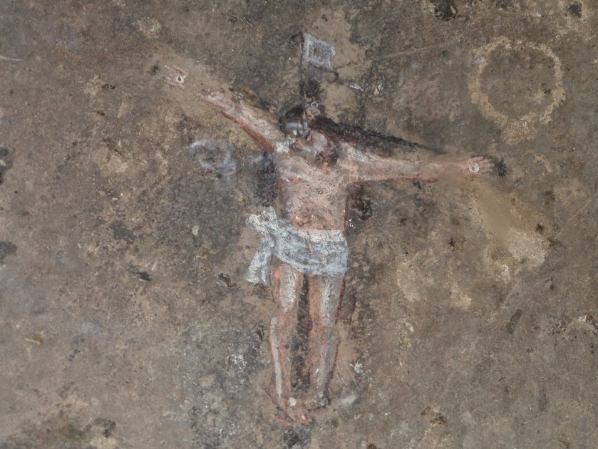 Aquella mañana, aquel campesino escardaba la tierra con ayuda de una yunta de caballos, y mientras avanzaba en su labor, la yunta se atoró con una piedra que no pudieron mover. Pasó largo rato para que aquel campesino pudiera sacar la piedra del camino, y tras muchos esfuerzos logró que esta saliera rompiendo la yunta. Cansado, el campesino se sentó junto a la piedra y con sorpresa notó que en aquel trozo de roca se encontraba plasmada la imagen de Cristo crucificado.