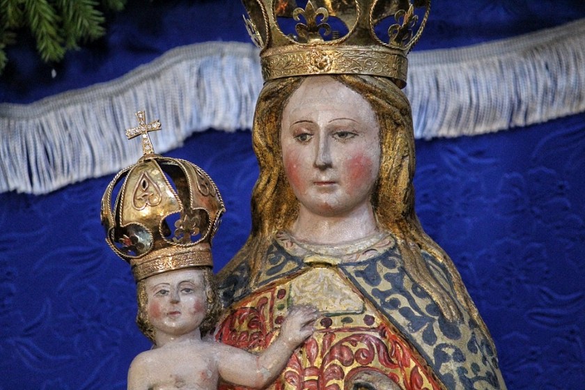Por el año de 1700, se le añadió a la escultura de la Virgen una imagen de San Fracisco de Asís como base, pues por aquellos años se decía que Dios estaba arrepentido de haber creado al hombre por su mal comportamiento y quería destruir la tierra, pero la Virgen intercedió por la humanidad, pidiéndole a su hijo Jesús que le diera una última oportunidad. Dios aceptó la propuesta de la Virgen y Ella le encarga a San Fracisco predicar a todo el mundo, es por eso que San Francisco lleva el mundo acuestas y la Virgen está de pie sobre el mundo como mediadora entre Dios y los hombres.