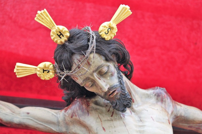El sacristán se dirigió por las sillas a una bodega que se encontraba en el interior del curato, lugar donde, entre otras cosas, se hallaba una imagen de Cristo Crucificado tallada en madera que estaba deteriorada y carcomida por la polilla, pero para asombro del sacristán, del crucifijo brotaban gotas cristalinas como si el Cristo estuviera sudando.
