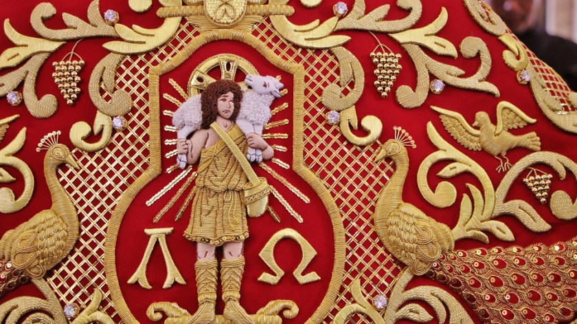 El manto es de color rojo y representa el sacrificio de Cristo en la Cruz, pues evoca su sangre derramada como precio de nuestra salvación. Otros elementos son:
