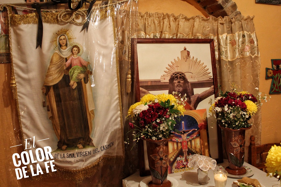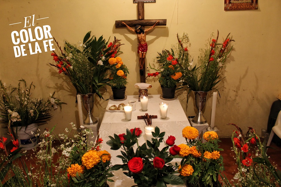 En este altar también se colocan flores y si la familia así lo quiere, se pone la fotografía del fallecido. A la entrada de las casas se pegan letreros invitando a los vecinos a ser participes de los rezos y durante nueve días consecutivos se reza el Santo Rosario acompañado con oraciones, jaculatorias y alabanzas propias para los Fieles Difuntos que también se entonan durante los funerales y la levantada de cruz.