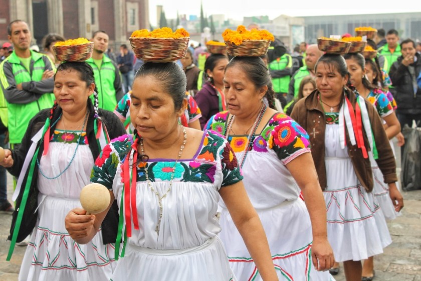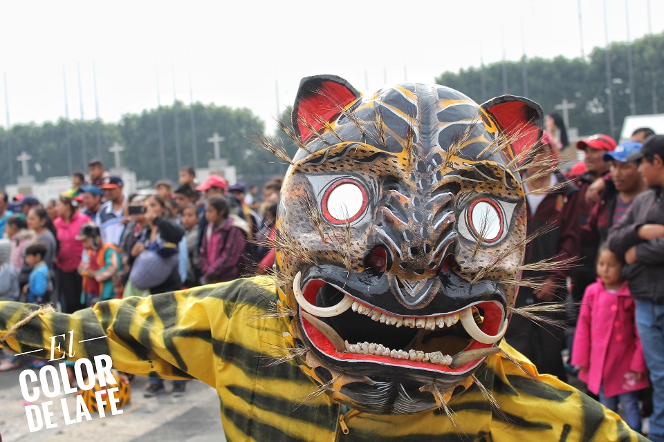 Sombreros, máscaras, listones que trenzan el cabello de las mujeres, trajes típicos bordados, tocados de plumas y flores, el ritmo de tambores, violines, guitarrones o instrumentos como caracoles y chirimías se combinan formando un ambiente de color y música, ofrenda que sube hasta el cielo alegrando el corazón de la Madre de Dios.
