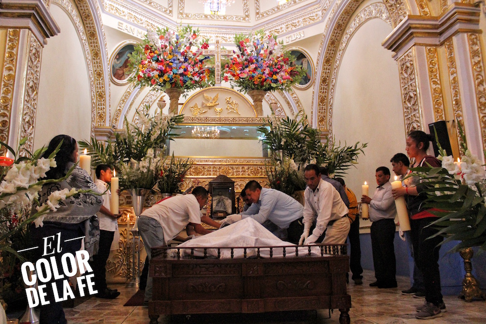 «Se oía hablar que cuando lo cambiaban encontraban en las sábanas arenilla del cerro de Xaltepeque, entonces se decía que él provenía del cerro de Xaltepeque, que es el cerro más elevado en la parte norte del pueblo… haciendo la investigación a fondo, con una familia encontramos un documento que narra que en el año de 1526 es hallado el Santo Entierro en el cerro de Xaltepeque, es bajado y llevado en andas a la plaza del pueblo», explica Amado Martínez.