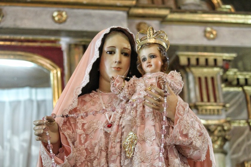 La imagen de la Virgen del Rosario es engalanada con un vestido y un manto que donan fieles voluntarios como una ofrenda a la Virgen, y junto con el Niño Jesús que lleva en sus brazos, porta una corona que la identifica como la Reina del Santo Rosario. Para la fiesta del domingo, es bajada de su nicho y colocada en el altar para que las personas puedan venerarla y admirarla de cerca, ya que es la única fecha en que baja de su retablo.