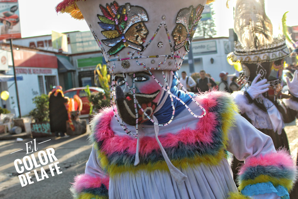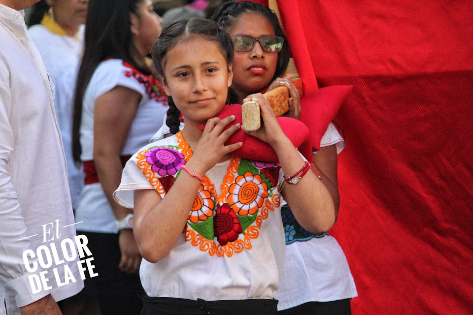 Con su tradicional brinco al ritmo de la banda, los chínelos abrieron paso a la Virgen de los Dolores, quien acompañada por el Niño de Belém, llegó entre porras y aplausos a la Catedral de Xochimilco, para ser entronizada en el altar dispuesto para la celebración solemne.