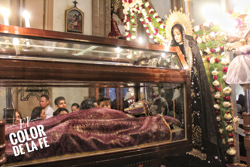 Al pie de la cruz de flores, a la cabecera del Santo Entierro se coloca la imagen de la Virgen de la Soledad que se venera en la Parroquia de San Lucas y que llaman La Pacificadora, porque durante la Guerra Cristera, los cristeros entraron a Ixtapalapa e intentaron profanar el Santuario del Señor de la Cuevita, entonces conocido como el Calvario de Ixtapalapa.