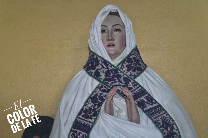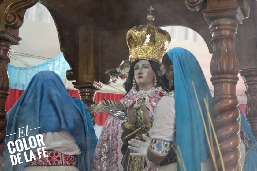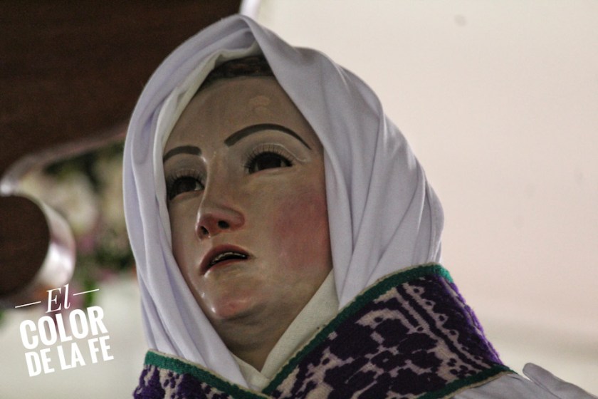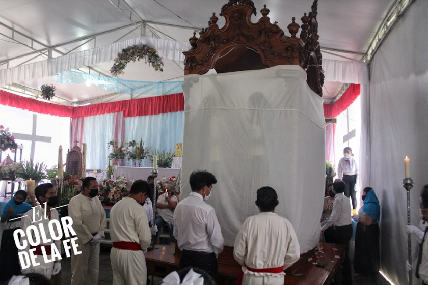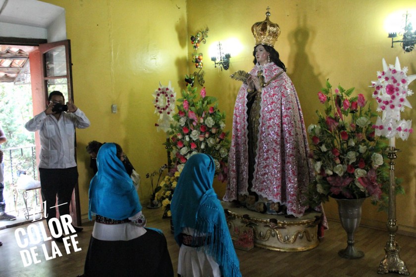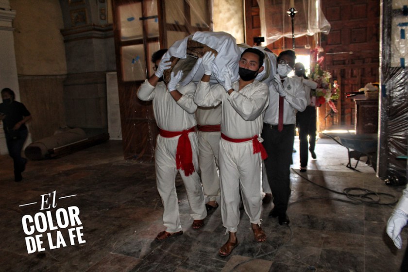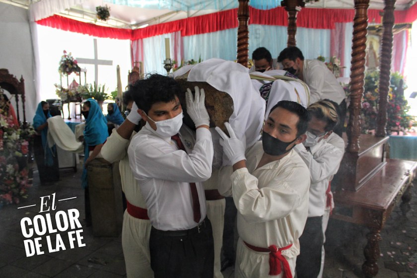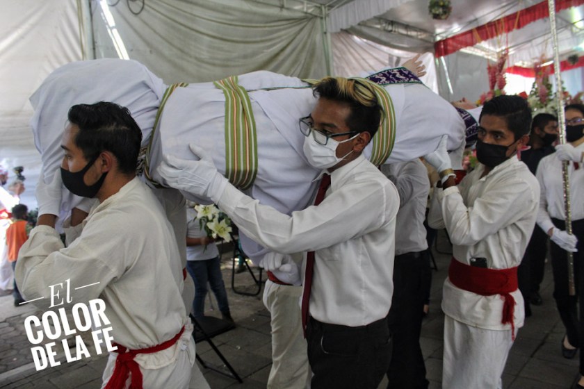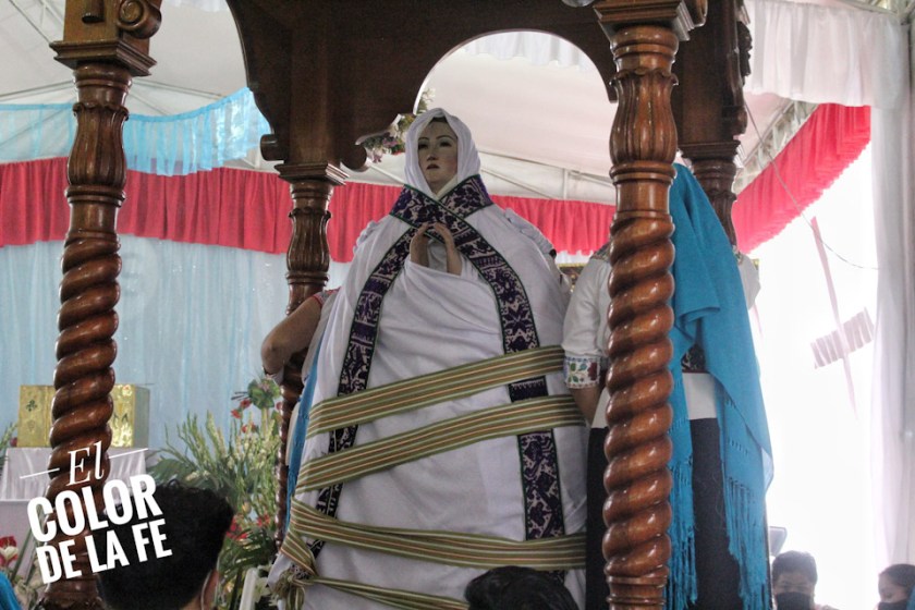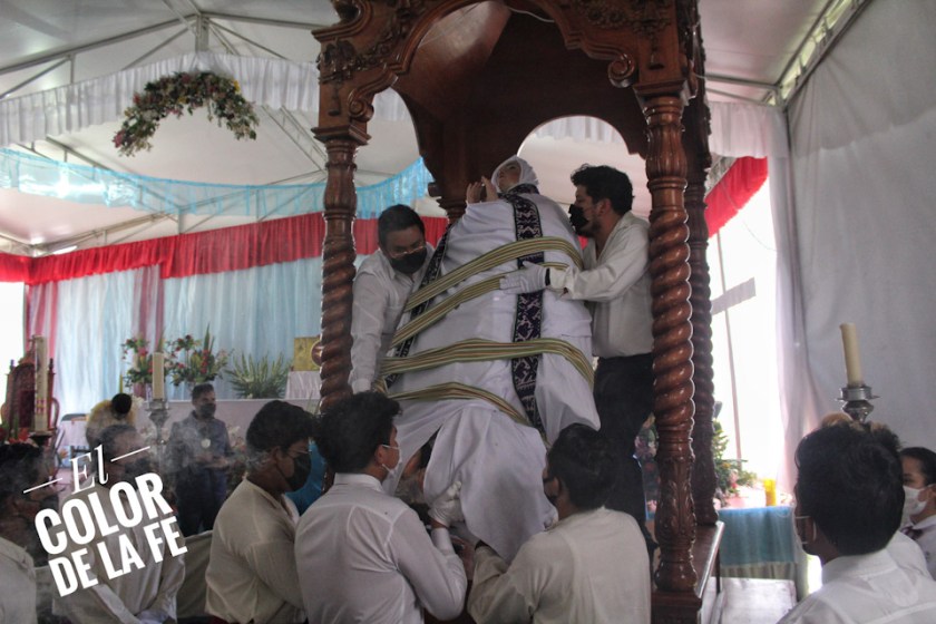 Después de envolver la imagen en una manta y sujetarla con un ceñidor bordado, el trono se descubre y la Virgen desciende para ser llevada en hombros por un grupo de inditos que con respeto la trasladan por el atrio, pasando por el interior del templo parroquial, que actualmente se encuentra en restauración, para llegar al convento y entronizar a la Santísima Virgen.