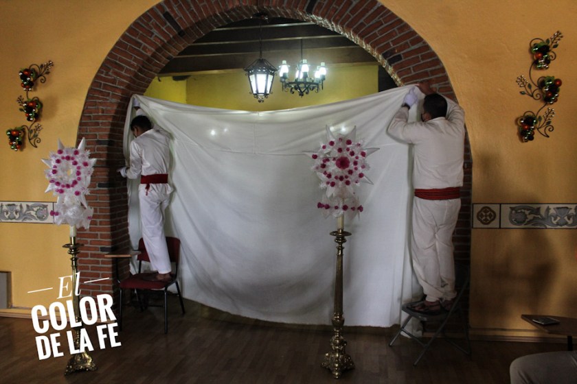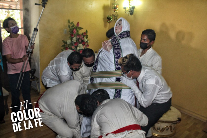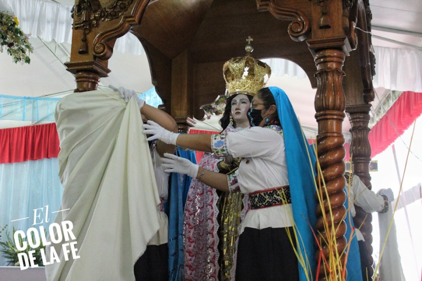 Una vez en el lugar donde se coloca sagrada la imagen, se pide a las personas presentes que únicamente permanezcan las señoritas designadas para revestir nuevamente a la Virgen con sus ornamentos y se cubre el espacio para cuidar la intimidad de la Virgen de la Asunción. Ya con sus ornamentos, la Virgen se descubre y las inditas se despiden haciendo una reverencia frente a la Señora del Cielo, concluyendo así los festejos en su honor.