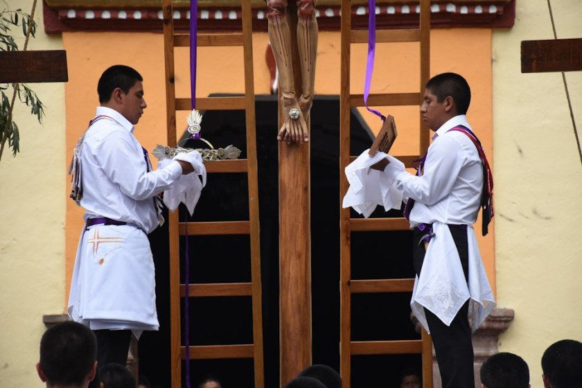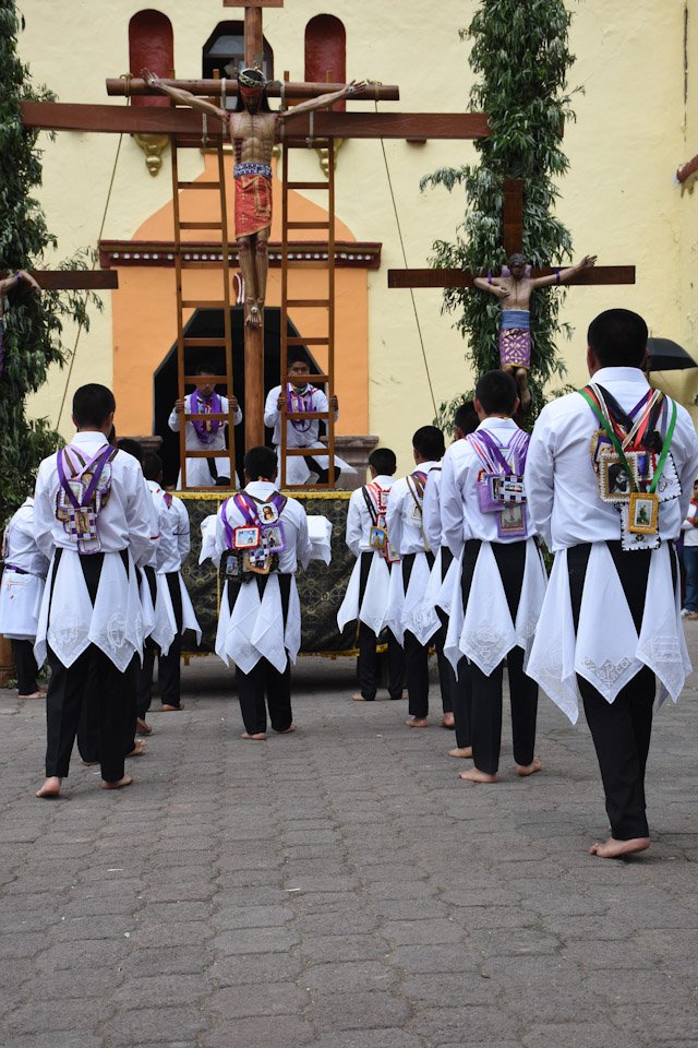 Al finalizar el viacrucis, los Varones van a sus casas presurosos para vestirse con la ropa tradicional para el descendimiento; regresan lo más pronto posible a la parroquia. La vestimenta para este momento consiste en un pantalón de vestir negro, camisa blanca, seis pañuelos blancos deshilados colocados alrededor de su cintura, listones en el cuello con plegarias al santo de su devoción (reliquias) y más de una docena de escapularios que cuelgan de sus hombros con imágenes religiosas. Durante este día Los Varones, usan una fragancia con aroma de flor de naranjo.