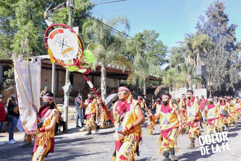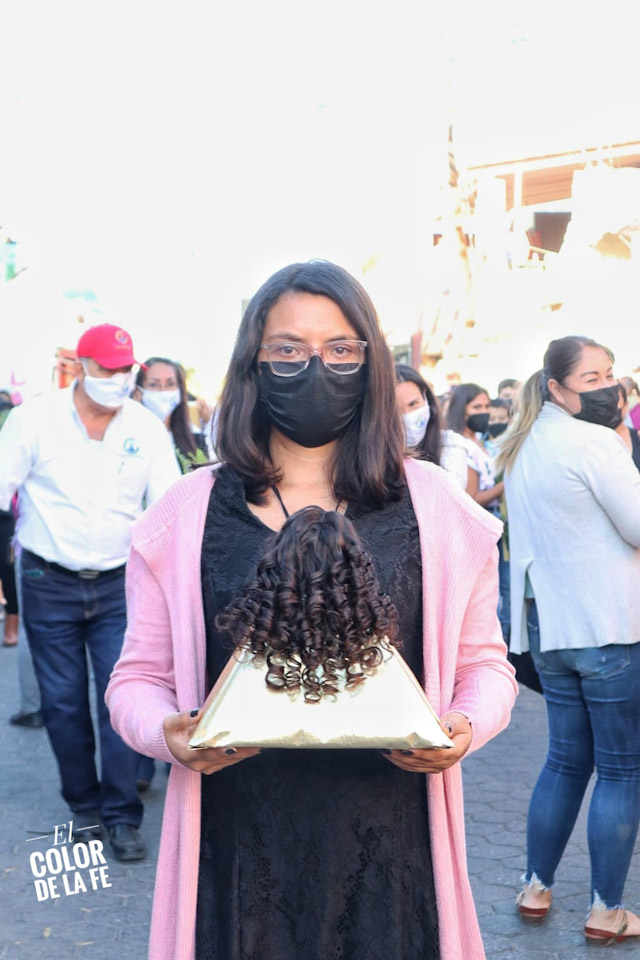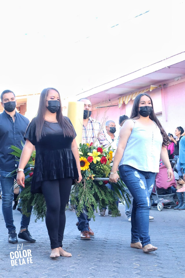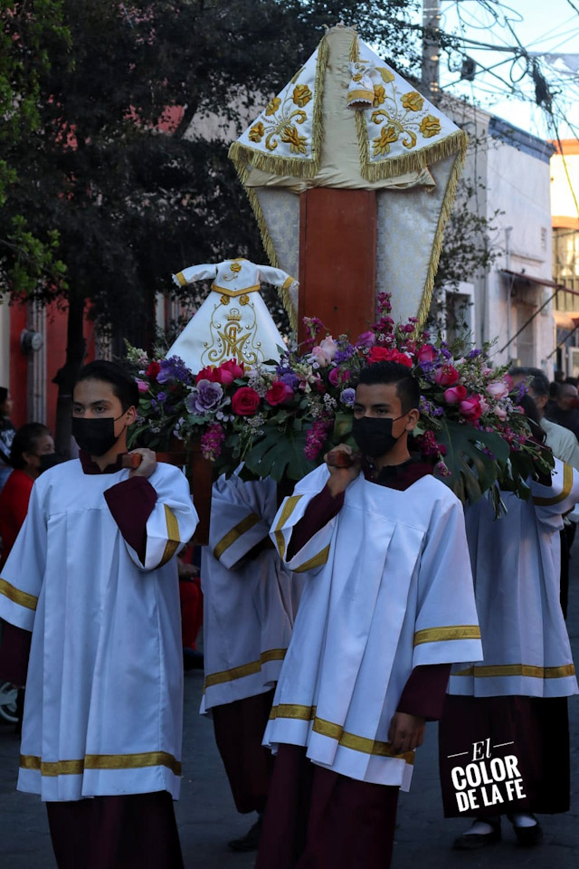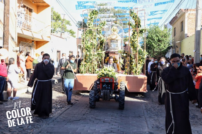 Por la tarde se lleva a cabo la solemne procesión con la Imagen de la Virgen por algunas calles de su pueblo. Es de las pocas o la única vez en el año que la Imagen original baja de su trono para salir a bendecir a sus hijos y devotos. Generalmente es acompañada por los grupos pastorales de la parroquia, peregrinos venidos de varios puntos del país, danzas y los frailes franciscanos. Este año solo salió acompañada por su Guardia de Honor, por los frailes y un pequeño grupo de fieles. El pueblo pudo contemplarla desde las banquetas de la calle para verla pasar e implorar un favor o dar gracias por alguno recibido.