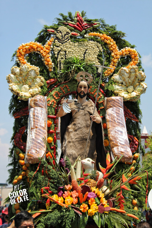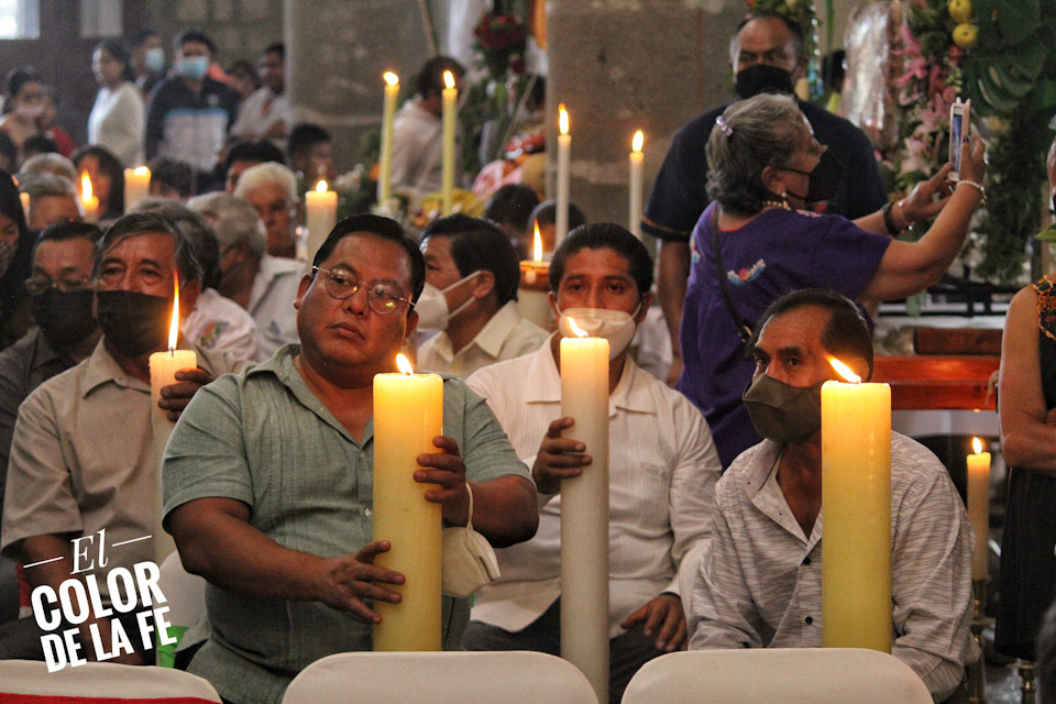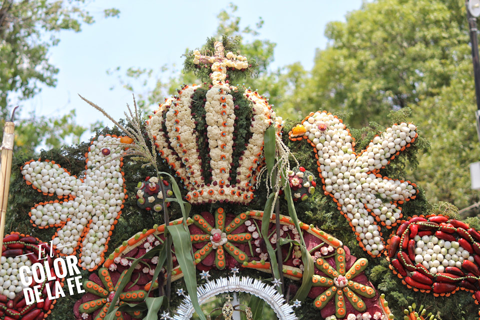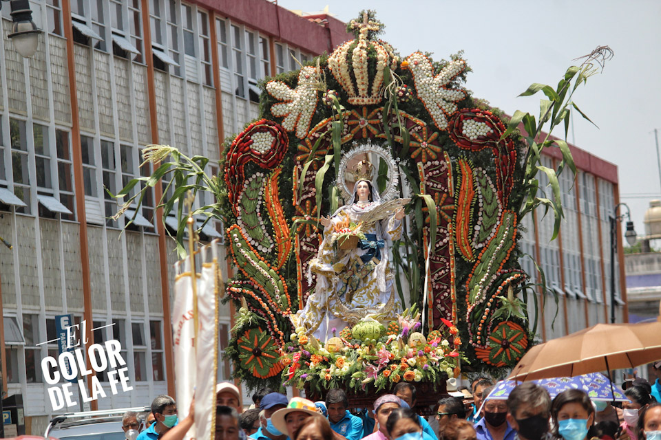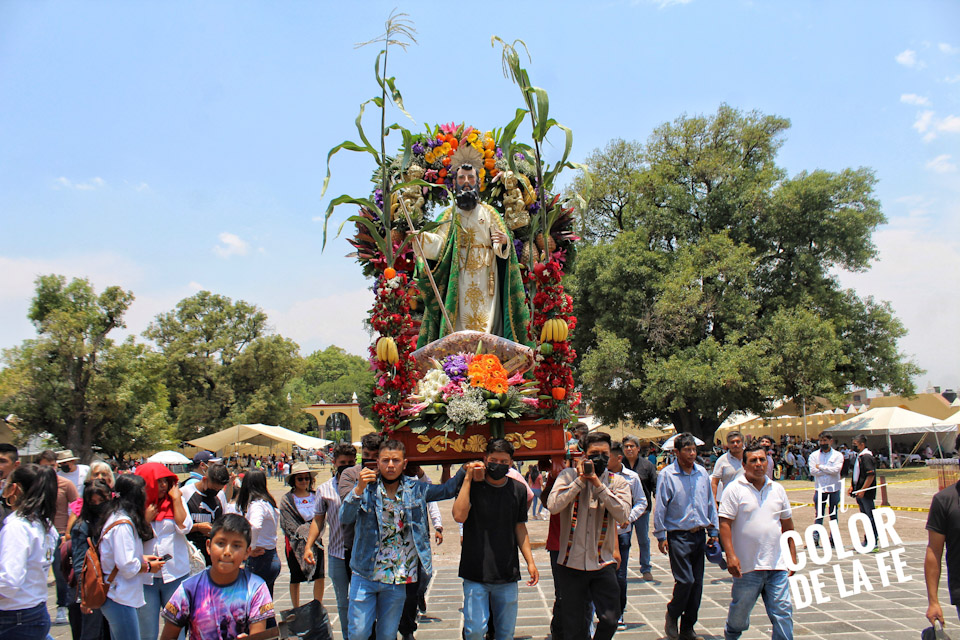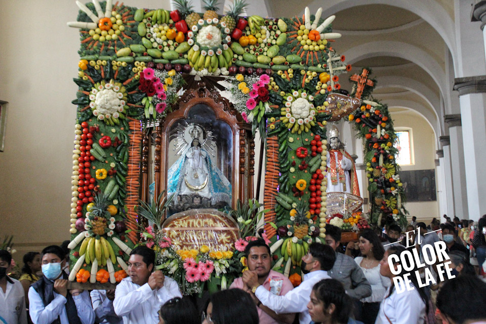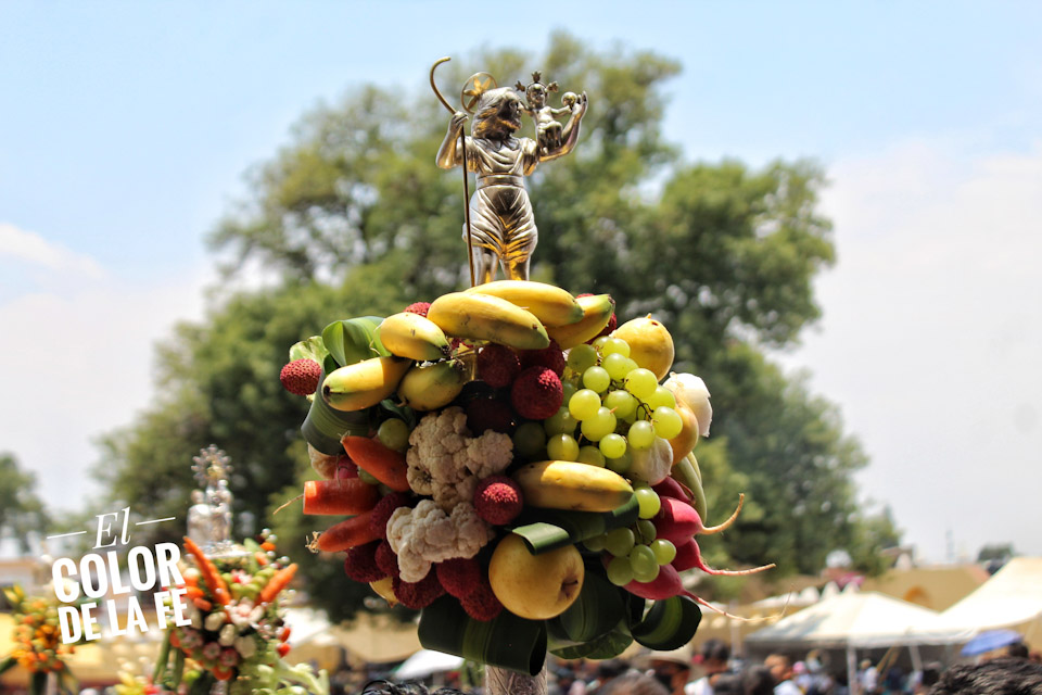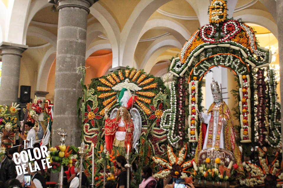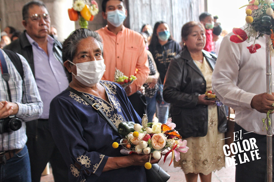 Entre vivas, porras, aplausos y música, las imágenes llegan a la Capilla Real de Naturales y en orden de su fundación, comienzan a entrar los patrones de los barrios con sus respectivos mayordomos quienes portan cirios y bastones de mando o demanditas, bellamente adornadas con flores, frutas y legumbres, o listones de colores, para ser participes de la santa misa y agradecer a Dios por los primeros frutos y pedir por una cosecha abundante.