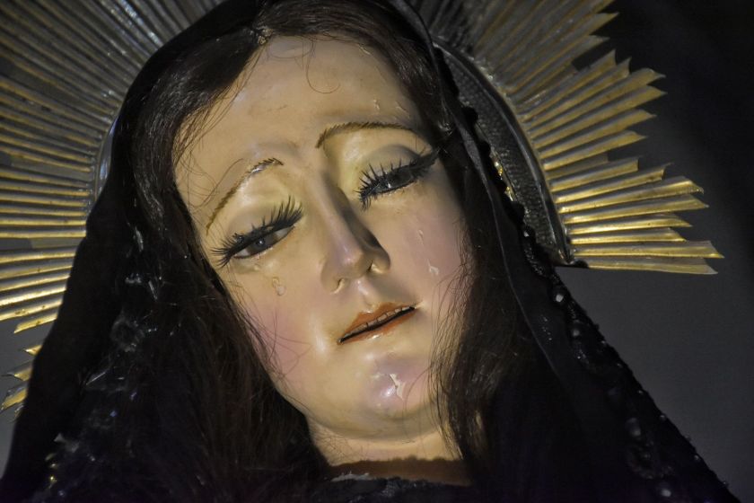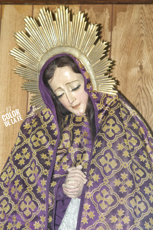 Al entierro concurrieron sin falta los servidores del hospital, y uno de ellos pidió al licenciado Molano que no echaran en el pozo una estatua de la Virgen María, al parecer una Dolorosa, que le había llenado los ojos con su hermosura y quería tenerla en su casa con toda veneración. El deseo le fue concedido a este servidor que tenía fama de hombre piadoso, bueno, apacible y sencillo; y para demostrar que había cumplido con su promesa, presentó a los directores la imagen muy bien ataviada con un lindo vestido de terciopelo negro, con bordados de plata que había labrado su mujer, excelente bordadora, y un largo manto con bordados exquisitos.